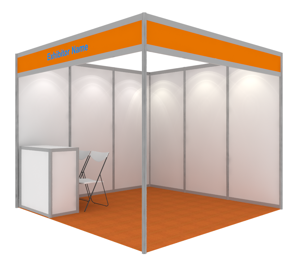 Space, walls on the three sides, carpeted floor, fascia board in English, one information desk, two chairs, one electrical socket and two lights per stand.
